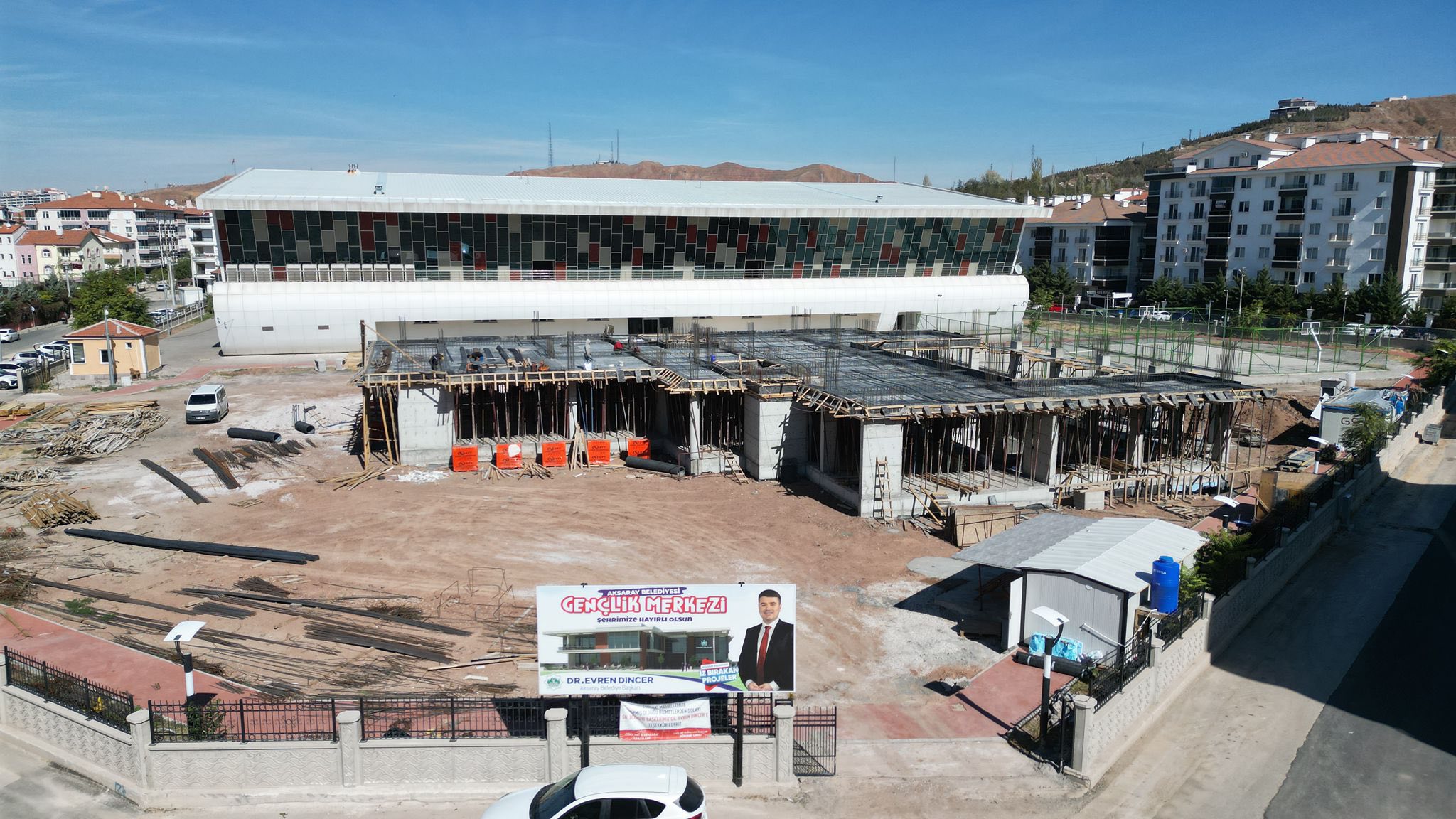 Aksaray Belediyesi tarafından geçtiğimiz aylarda temeli atılan projenin inşaatı hızla ilerliyor. İlk etapta perde beton ve taşıyıcı kolon imalatlarının tamamlandığı projede, ekipler ince işçilik ve tesisat montajlarına geçti. Modern mimarisiyle dikkat çeken yapı, tamamlandığında Aksaray’ın sosyal ve kültürel yaşamına değer katacak.
