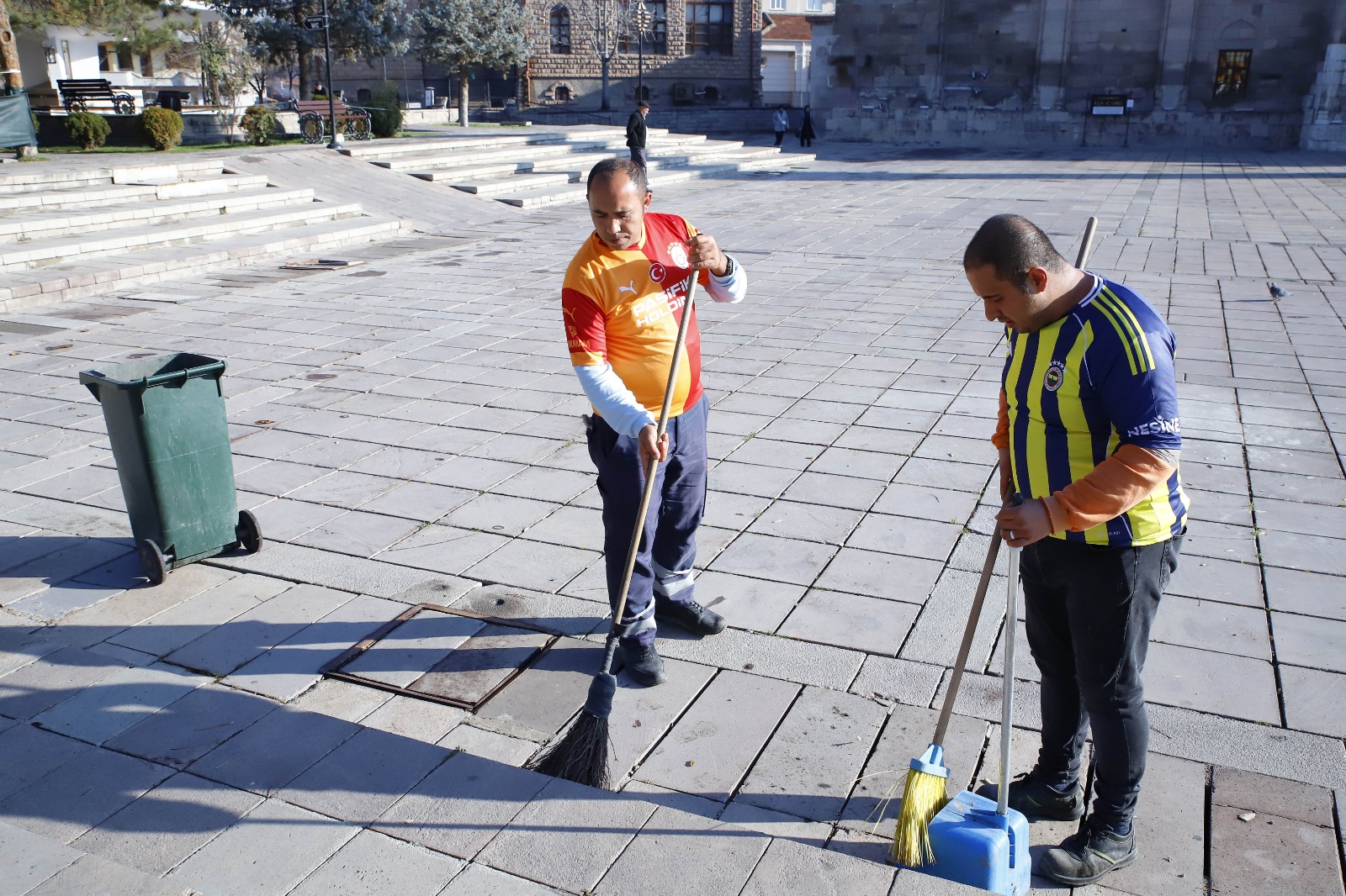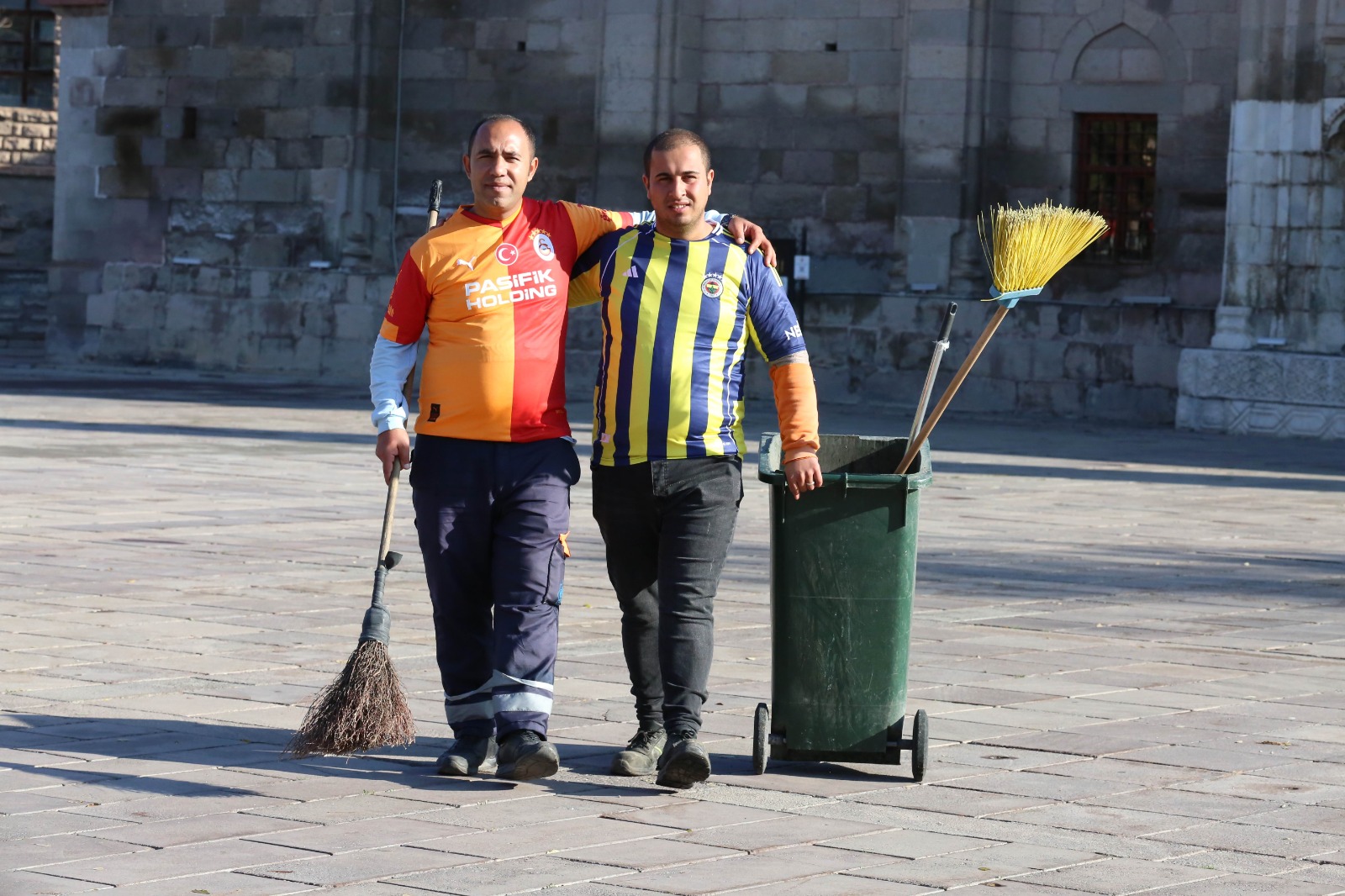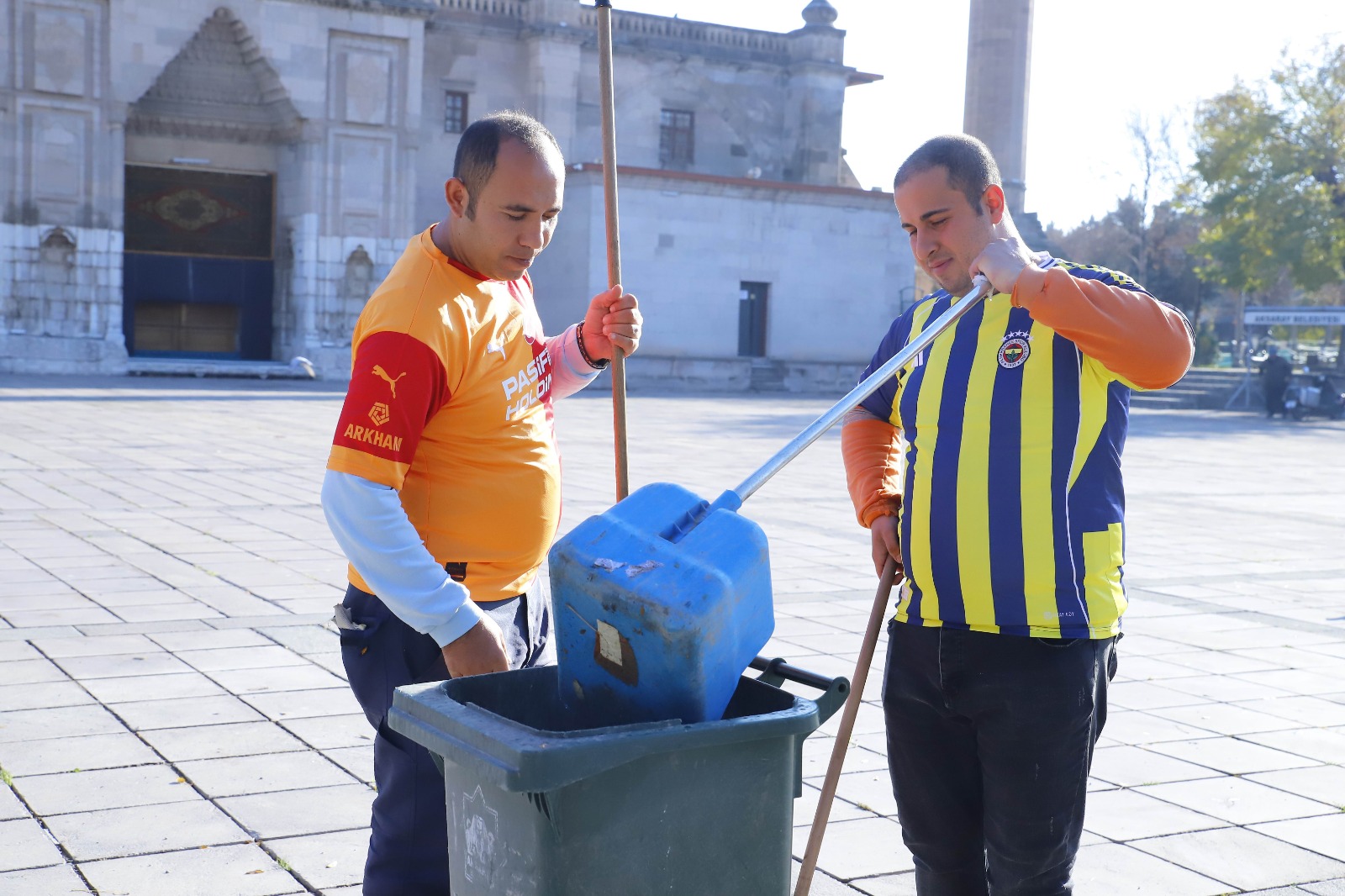 Aksaray Belediyesi Temizlik İşleri Müdürlüğü’nde görev yapan Hazret Özkanlı (35) ve Ferdi Yılmaz (27), tuttukları takımların formalarını giyerek işe geldi.