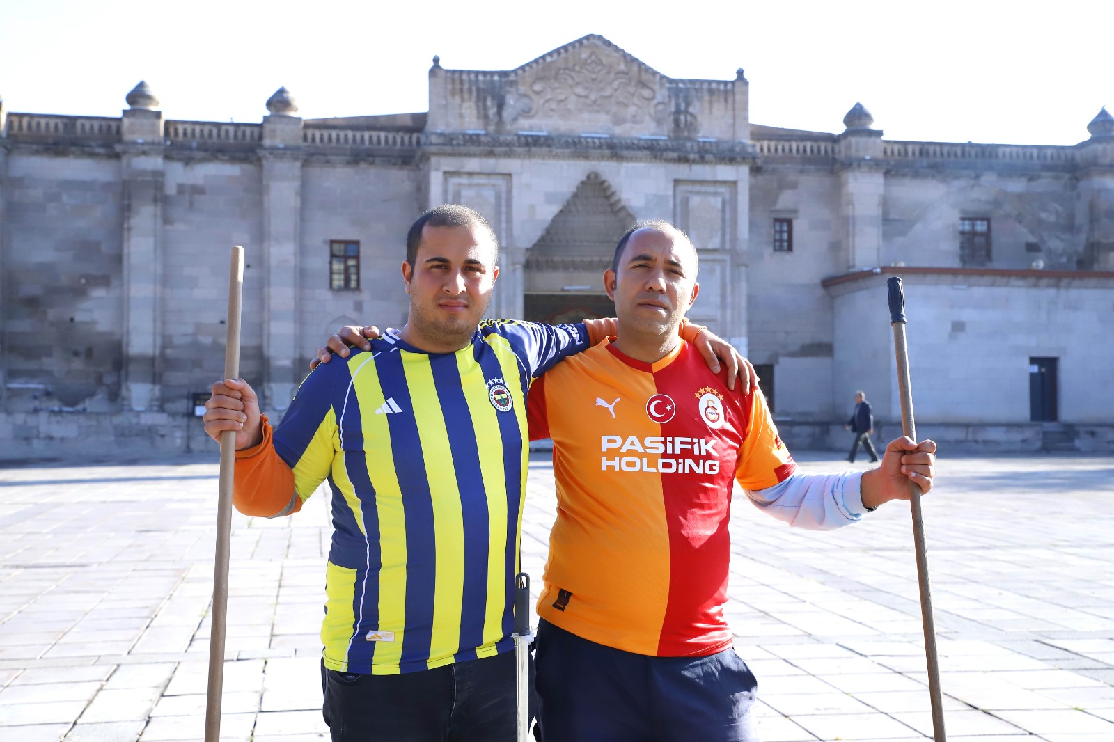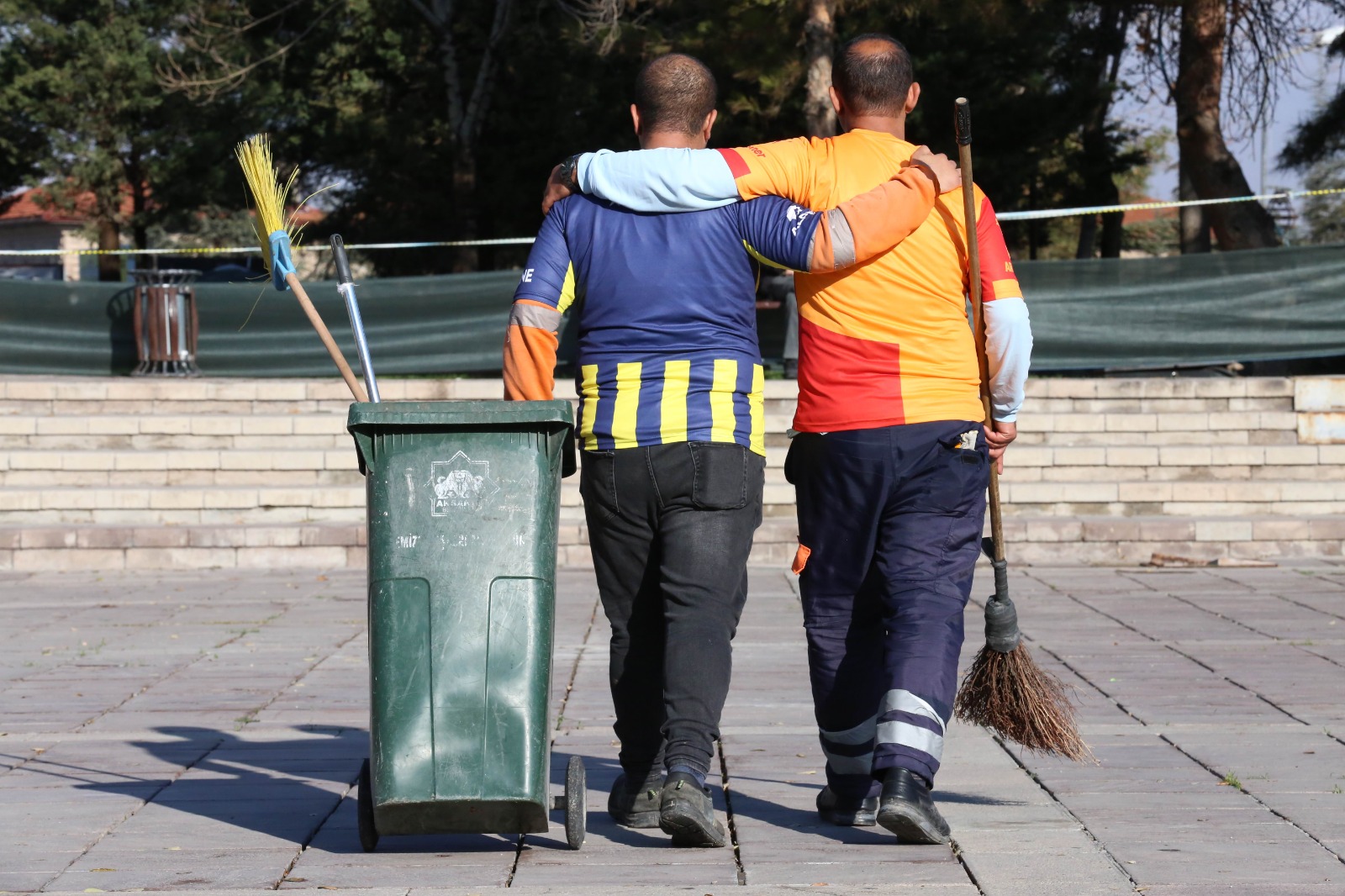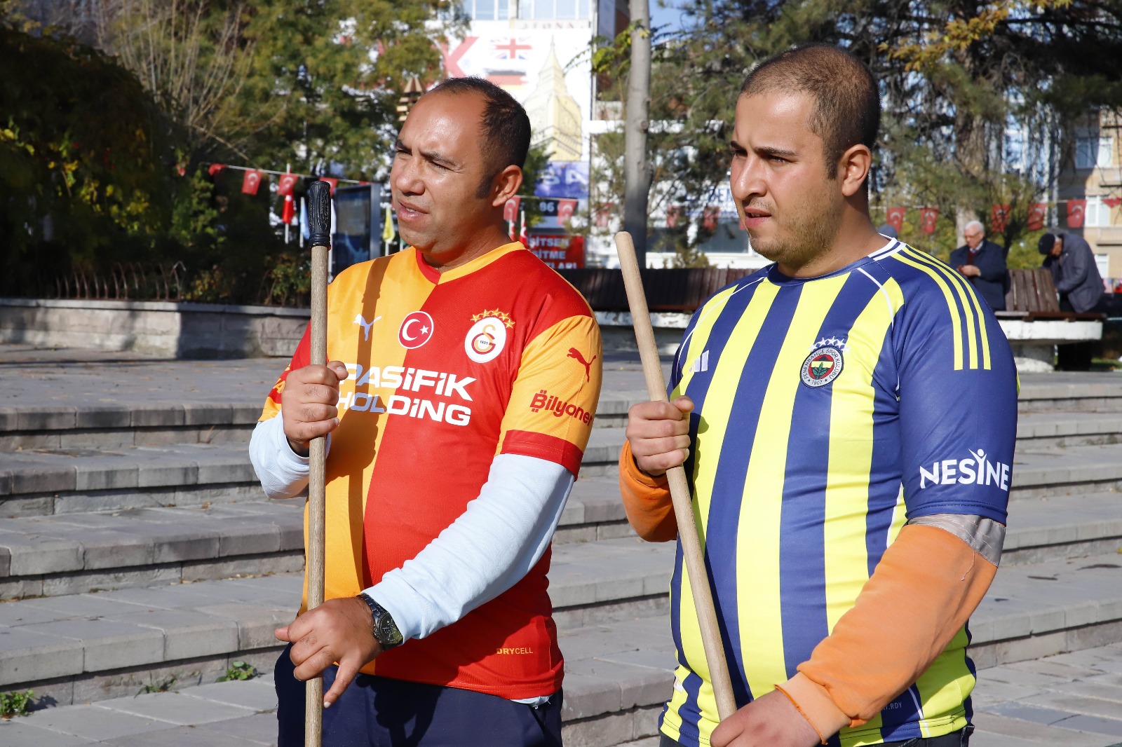 Aksaray Belediyesi Temizlik İşleri Müdürlüğü’nde görev yapan Hazret Özkanlı (35) ve Ferdi Yılmaz (27), tuttukları takımların formalarını giyerek işe geldi.